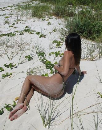 The strings of her bikini were decorated with amber beads, and she accessorized with small gold hoop earrings and a silver ring with a dark square gem.